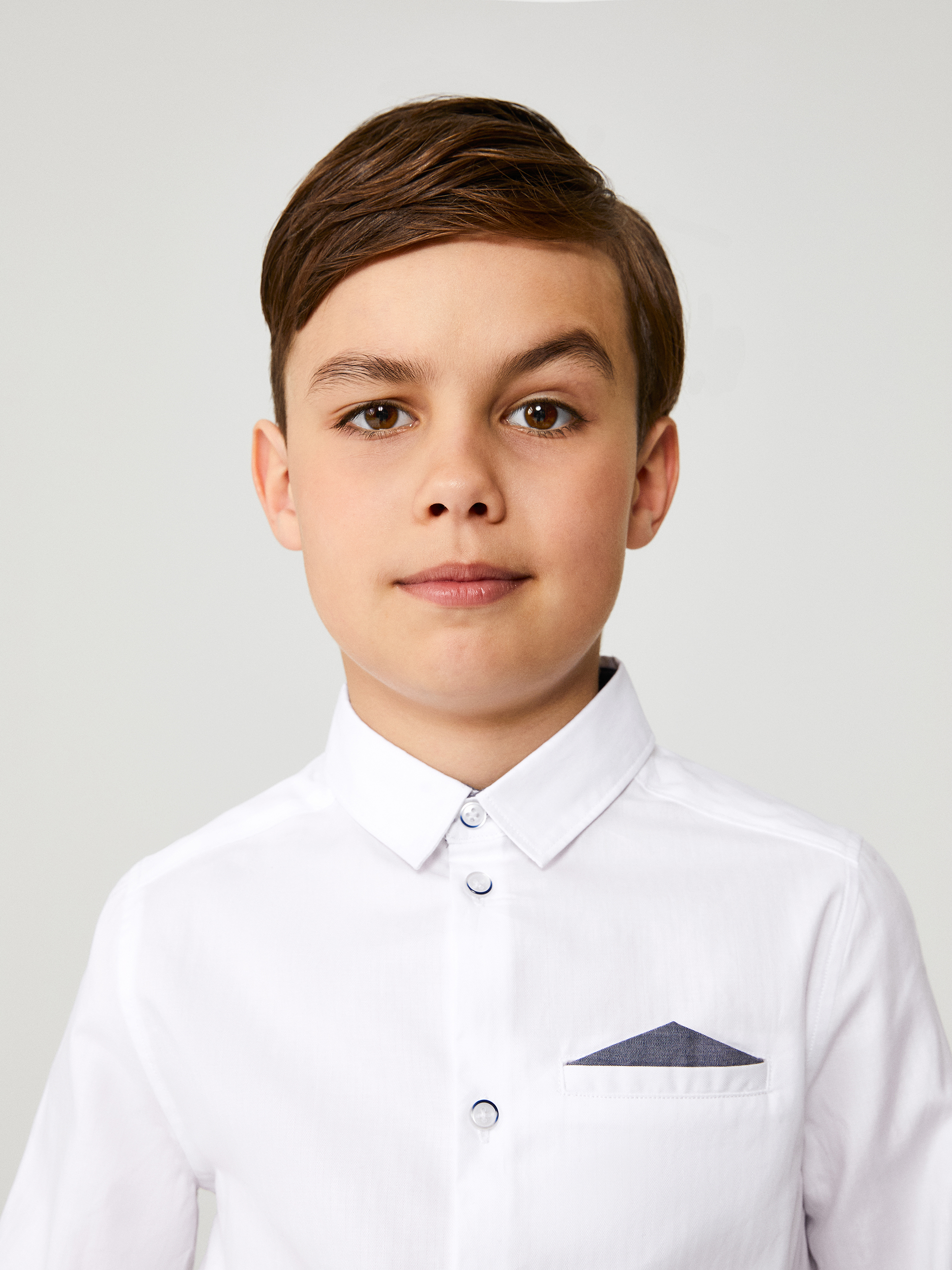 На передней части рубашки расположен прорезной карман на пуговице с имитацией платка. Кокетка на спинке придаёт модели утонченный вид. Манжеты на пуговицах добавляют элегантности и удобства. Рубашечный воротник придаёт модели строгий и стильный вид. Изделие выполнено в базовых оттенках, что позволяет выбрать рубашку под любое настроение и школьное мероприятие.