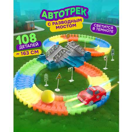 Гибкий трек от 1TOY задает новый тренд традиционной игре с машинками. Дорогу можно не просто собрать так, чтобы гоночная трасса поворачивала и петляла в разные стороны (благодаря специальным деталькам - рельсам), но также сделать выпуклой или вогнутой или вообще "закольцевать", заставив гоночную машинку ехать внутри нее, словно хомячка внутри специального круга. Автодорога детская светится в темноте. В набор входит трек, светящаяся машинка с пятью светодиодами, разводной мост, дорожные знаки - всего 108 деталей. Детали разных наборов гибкого трека, кроме наборов "Ночной экспресс", совместимы между собой. Совмещая наборы, можно получить большую дорогу для машинок. Светящийся автотрек предназначен для детей старше 3 лет. Трасса для машинок содержит мелкие детали. Работает от 2 элементов питания типа АА. В комплект не входят. Чтобы дорога светилась, ее необходимо подержать под источником света.