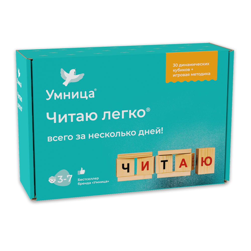 Умница. Читаю легко. Деревянные кубики со слогами для обучения чтению. Это набор кубиков для малышей от 3 лет и старше, благодаря которому, ребенок быстро научится читать, даже не зная букв! Авторская методика Е.Чаплыгина – идеальное решение для игровых домашних занятий, а также для подготовки к школе. Родителям не нужно никаких дополнительных навыков, материалов или усилий. В комплекте есть все, что нужно, чтобы малыш легко освоил чтение. В составе: - 10 одинарных - 10 двойных кубиков - Книжка-шпаргалка «Как научить ребёнка читать за три дня» - 15 двусторонних и 10 односторонних карточек с картинками.
