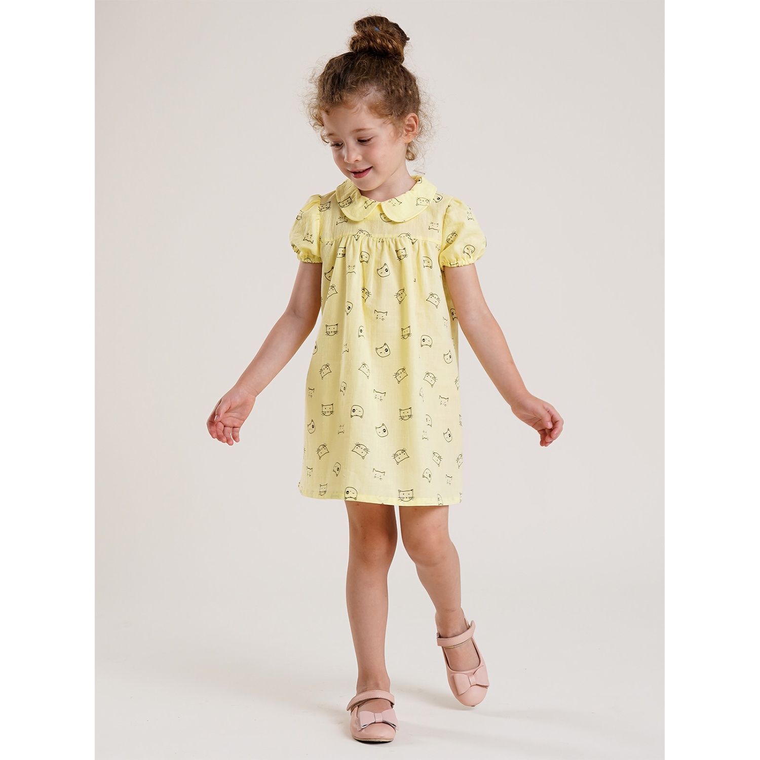 Легкое летнее платье Ete Children жёлтого цвета. Круглый воротничок, рукава-фонарики на резинке. Застёжка на молнии на спинке изделия. Принт: "Кошечки". Размеры: 98,104,110,116,122,128.