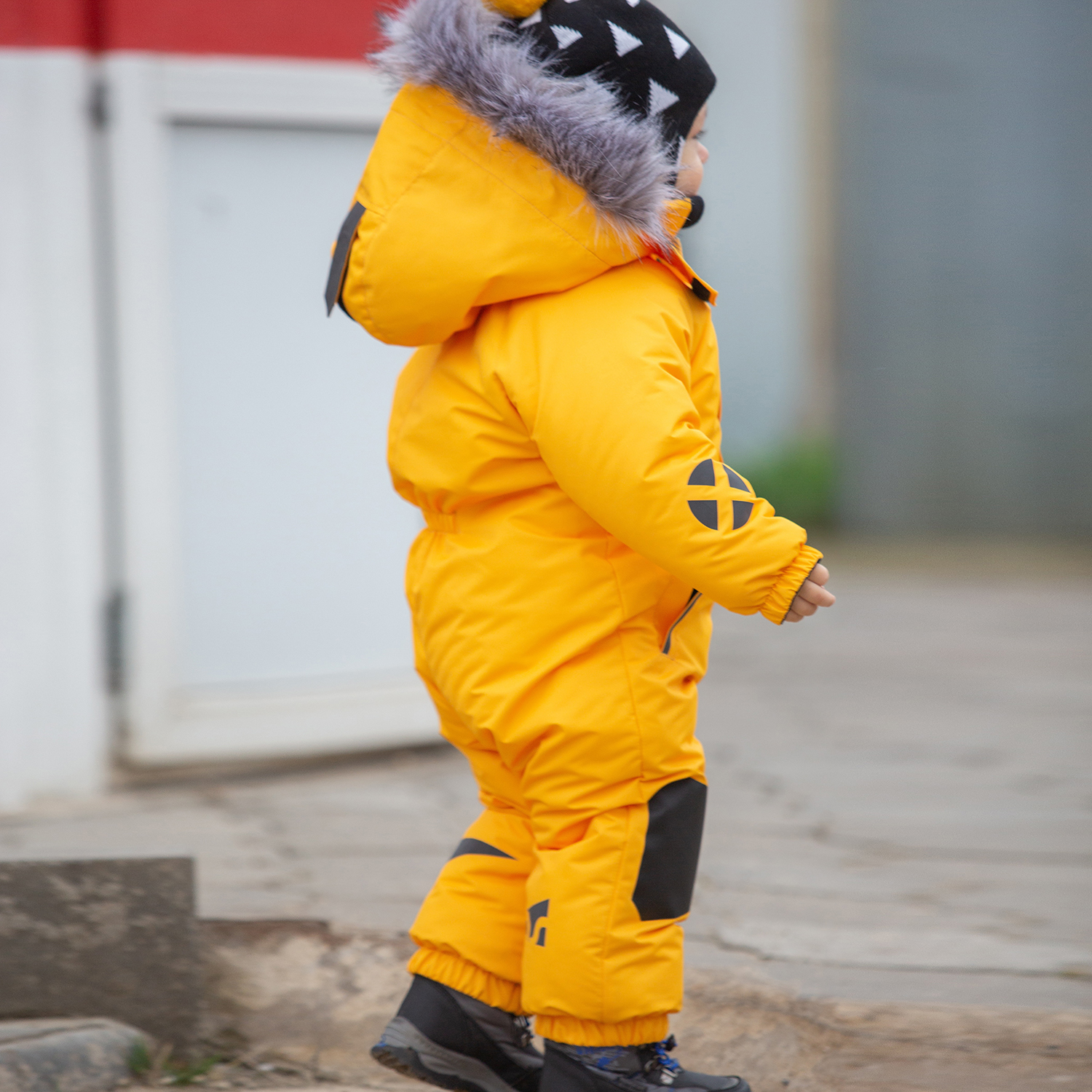 Комбинезон для девочки, доя мальчика из мембранной ткани для малышей. Специальная конструкция капюшона надежно защищает затылочную часть и шею от ветра, даже если он снят. Глубину капюшона можно отрегулировать специальным клапаном. Отстегивающаяся опушка из искусственного меха на кнопках. Удлиненная реверсная молния для удобства одевания, ветрозащитная планка, мягкий клапан для защиты подбородка и шеи ребенка от защемления. Особенностью модели является усиление специальной тканью частей изделия, подверженных увеличенному трению. Светоотражающие элементы. В комплекте силиконовые штрипки. Герметизация стратегических швов в нижней части изделия. Подкладка - интерлок, в рукавах - полиэстер. Утеплитель Termofinn 300 гр. Рекомендованный температурный режим до - 35С (необходимо учитывать нижние слои одежды, степень активности ребенка, климатические условия региона).