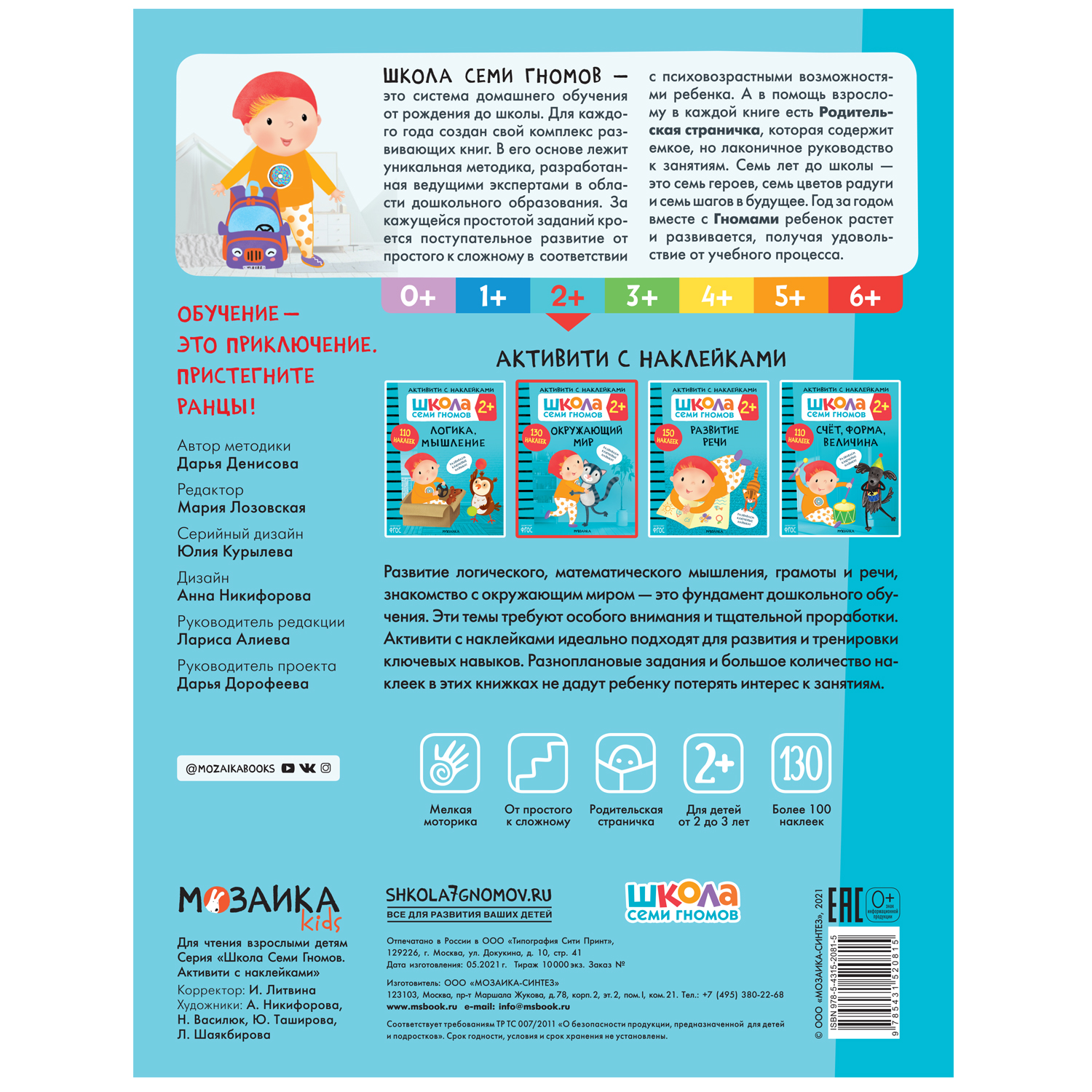 Окружающий мир 2+ (Серия «Школа Семи Гномов. Активити с наклейками»), книжка с наклейками Книга «Окружающий мир 2+» из серии «Школа Семи Гномов. Активити с наклейками» предназначена для расширения кругозора и знаний об окружающем мире детей от 2 до 3 лет.