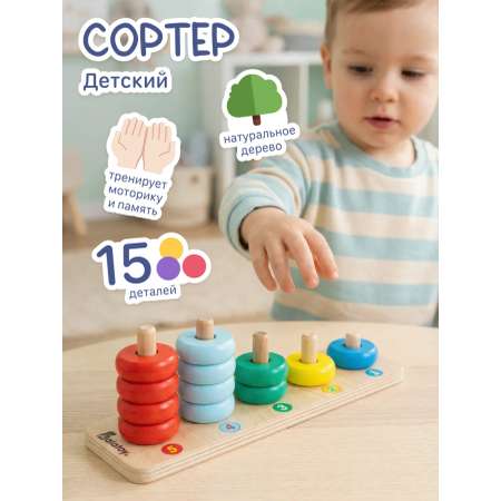 Пирамидка детская деревянная Счеты для малышей Алатойс Сортер Монтессори (15 деталей)