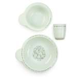 Набор посуды для малыша содержит всё необходимое - кружка, миска и тарелка. Размер предметов учитывает анатомическое строение ребенка - малышу комфортно есть из своей посуды. Тарелки просто переносить или доставать из микроволновки благодаря особой форме с язычком, кружку без ручек удобно держать. Качественный и прочный материал не позволит посуде разбиться при случайном падении. Практичный и яркий набор превратит каждый обед в весёлую игру. Вся посуда имеет прорезиненное дно.