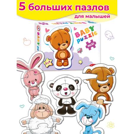 Крупные пазлы подходят для самых маленьких и помогут разнообразить занятия с ребёнком, сделать их интересными и полезными. В наборе 5 фигурок животных, разделённых на 2-3 элемента. Яркие узнаваемые картинки привлекут внимание малыша, а крупные детали из плотного картона помогут в развитии мелкой моторики.
