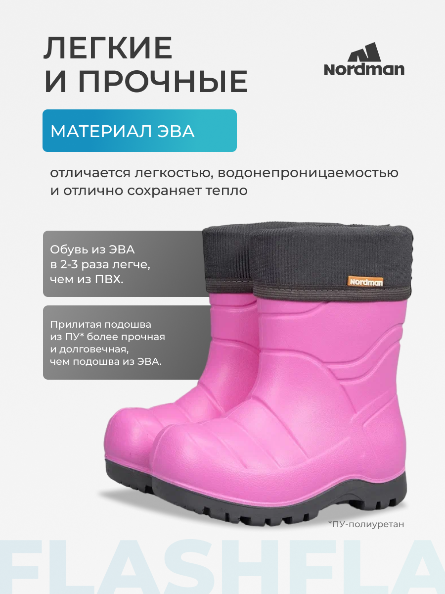 | Материал (состав): | Материал верха - 100% ЭВА, материал подошвы - 100% полиуретан, матриал подкладки - флис (80% хлопок, 20% полиэстер), материал стельки - флис (80% хлопок, 20% полиэстер). |