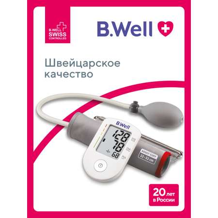 Тонометр B.Well PRO-30прибор для измерения артериального давления на плечевой зоне. Индикатор аритмии помогает выявить нарушения сердечного ритма на ранней стадии. Если во время измерения артериального давления тонометр обнаруживает нестабильность пульса и распознает аритмию, он отображает на дисплее специальный символ. Технология B.Well выявляет самые первые признаки аритмии, позволяя вовремя обратиться к специалисту и предупредить зарождающиеся заболевания сердца. Конусная манжета. Гарантирует комфортное и точное измерение. Анатомическая конусная манжета B.Well идеально облегает руку, равномерно распределяет давление воздуха, обеспечивает безболезненное измерение. Манжета удобна для самостоятельного измерения: конусная форма, специальное металлическое кольцо, широкая застежка позволят легко надеть ее даже одной рукой. Съемный чехол манжеты. Очистить манжету можно легко и просто благодаря съемному чехлу, который допускает стирку. Цветная шкала уровня давления. Подскажет уровень измеренного давления по классификации Европейского общества гипертонии (ESH). Компактный размер. Прибор удобно использовать дома и просто взять с собой. Прочный и удобный нагнетатель для впуска и выпуска. Большой трехстрочный дисплей. Память последнего измерения. Индикатор разряда батареи. Автоматическое отключение.