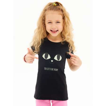Модная футболка для девочки с принтом кошки. Модель выполнена из хлопкового трикотажа. Детали: - круглый вырез; - короткие рукава; - футболка украшена оригинальным принтом.