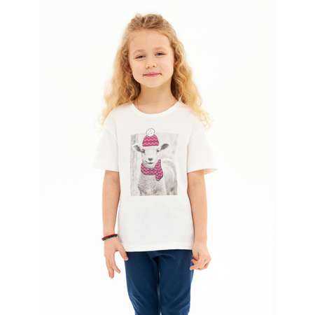 Модная футболка для девочки с принтом. Модель выполнена из хлопкового трикотажа. Детали: - круглый вырез; - короткие рукава с заниженной проймой; - свободный крой; - футболка украшена оригинальным принтом.