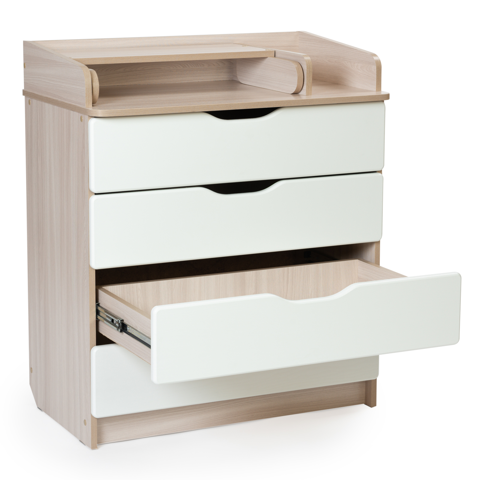 Комод оборудован пеленальным столиком с простым и надежным механизмом раскладывания, 4-е вместительных ящика.