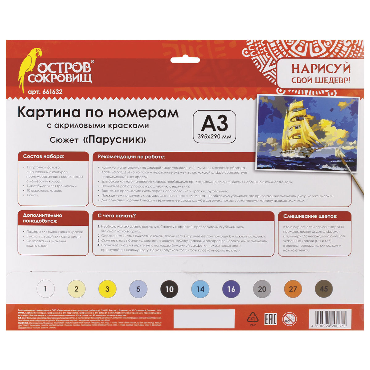 Картина по номерам ОСТРОВ СОКРОВИЩ – это отличный способ почувствовать себя художником и интересно провести время всей семьей. Работа над картиной развивает внимательность, усидчивость, аккуратность. В набор входит: 1 картонная основа с контуром, 1 лист бумаги для тренировки, 10 акриловых красок объемом 3 мл каждая и синтетическая кисть. Формат основы - А3 (395х290 см). Дополнительно понадобятся: палитра для смешивания красок, емкость с водой для мытья кисти, салфетка для удаления воды с кисти (В КОМПЛЕКТ НЕ ВХОДЯТ). Подходит для потребителей всех возрастов от 8 до 80 лет. Поставляется в картонной упаковке с европодвесом. • Тип товара: картина по номерам А3. • Вид творчества: рисование (роспись). • Сюжет: Парусник. • Количество предметов в наборе: 13. • Комплектация: акриловые краски, картон с нанесенным контуром, кисть, лист бумаги для тренировки. • Возрастная группа: 8-80 лет. • Пол: универсальный. • Материал: картон. • Длина готового изделия: 39.5 см. • Ширина готового изделия: 29 см. • Упаковка: картонная с европодвесом. • Артикул производителя: 661632.Цены в интернет-магазине могут отличаться от розничных магазинов.