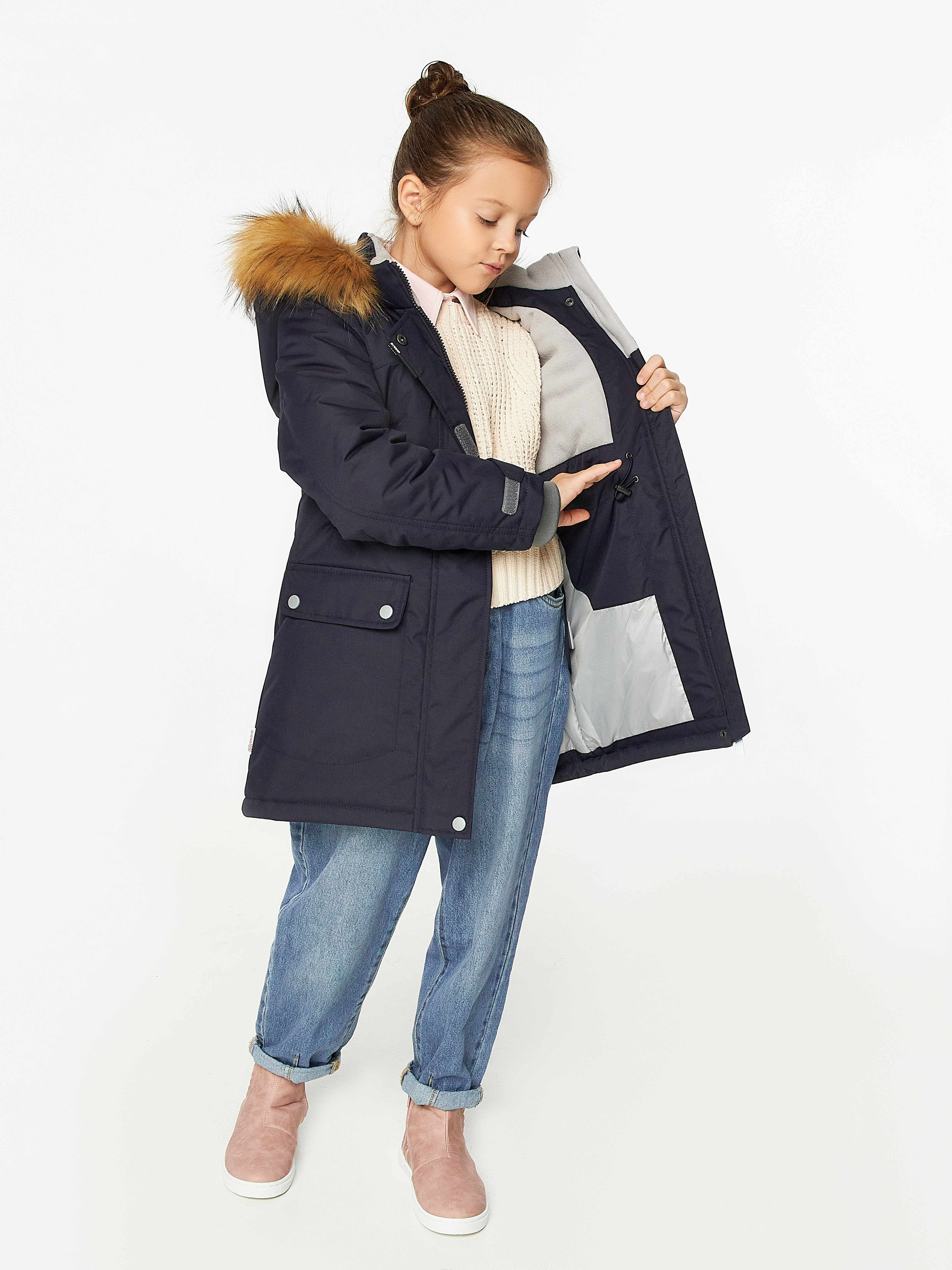 Зимняя куртка для девочки прямого силуэта. Застёжка на молнию закрыта планкой на кнопках и липучках. Подкладка комбинированная из флиса и шелка. Отстёгивающийся капюшон с подкладкой из флиса. К капюшону на молнию и кнопки пристегивается опушка из искусственного меха (енот). 4 передних кармана различной конфигурации.