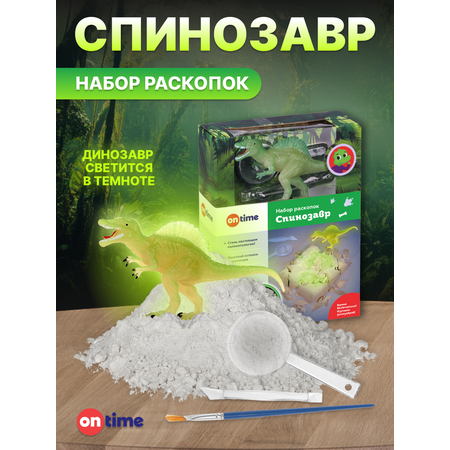 Набор для раскопок «Спинозавр» от ТМ “ON TIME” поможет ребёнку почувствовать себя в роли настоящего палеонтолога, изучающего древних динозавров. Юному исследователю предстоит раскопать останки Спинозавра и собрать скелет динозавра. Всё это очень интересно! К тому же, и игрушка, и скелет обладают одной очень эффектной способностью: они могут светиться в темноте. Спинозавр был самым крупным хищным динозавром, обитающим на нашей планете. Он жил на территории Северной Африки около 100 миллионов лет назад!В комплекте: гипсовый брусок со скелетом динозавра, кисточка, зубило, лупа, фигурка Спинозавра, инструкция.Изготовлено из полимерных материалов и гипса.