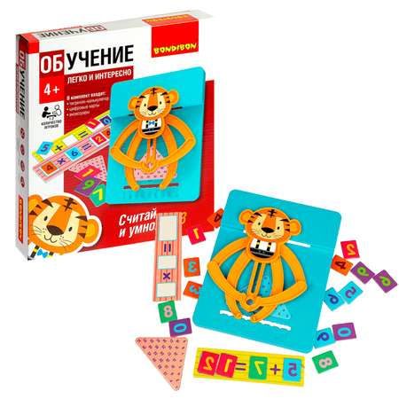 Обучающая настольная игра Считай и умножай Тигр от Bondibon – популярная и развивающая игрушка, которая содержит карточки для составления примеров, цифры и необычный детский калькулятор в виде животного, он в увлекательной игровой форме поможет ребенку научиться считать, складывать и умножать. Идеально подходит для детей, которые только начинают осваивать математику. Развивающий математический набор прекрасно подходит как для малышей, так и для дошкольников. Идеальный подарок мальчику и девочке на день рождения, новый год или 23 февраля. А также оригинальный и полезный сюрприз будущему первокласснику на выпускной в детский садик или на 1 сентября в школу. Выберите розовую карточку для тренировки навыков умножения или голубую - счета. Составьте пример на игровом поле. Выполните вычисление и проверьте решение на калькуляторе, поставив ноги животного на слагаемые или множители. Если задание выполнено верно, то в руках у мишки Вы увидите правильный ответ. Можно играть вдвоем, зарабатывая баллы за каждый правильный ответ. Первый, кто наберет 5 очков – победитель. Увлекательная игра поможет овладеть базовыми арифметическими знаниями, развить логику, память, мышление и внимательность. В набор входят: тигр-калькулятор, цифровые карты, аксессуары Предназначено детям от 4 лет. Эта дидактическая настолка отлично подходит как для развивающего досуга ребенка дома, так и для обучающих занятий с педагогом и воспитателем в детском садике. Такие развивающие головоломки полезны, как методическое пособие учителю для тренировки навыков счета в 1 классе. Логические нейроигры — это интересные и прикольные развивалки, которые отвлекут от гаджетов, помогут при подготовке к школе. Коробка с ярким дизайном - это оригинальный подарочный вариант новогоднего сюрприза. В коллекции товаров от Бондибон представлены детские обучающие и познавательные игрушки для девочек и мальчиков и крутые необычные развивашки для подростков!