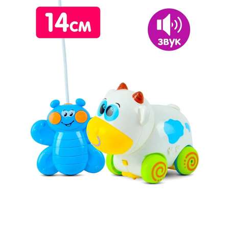 Игрушка на радиоуправлении "Бычок" с пультом управления, идеально подходит для малышей от 2-х лет. Он выполнен в ярком дизайне из прочных и безопасных материалов. Он может двигаться вперёд и назад, качать головой и вилять хвостиком. Игра с ним подарит много радости благодаря весёлой музыке и световым эффектам. Простой пульт управления с 2 кнопками - специально для малышей.
