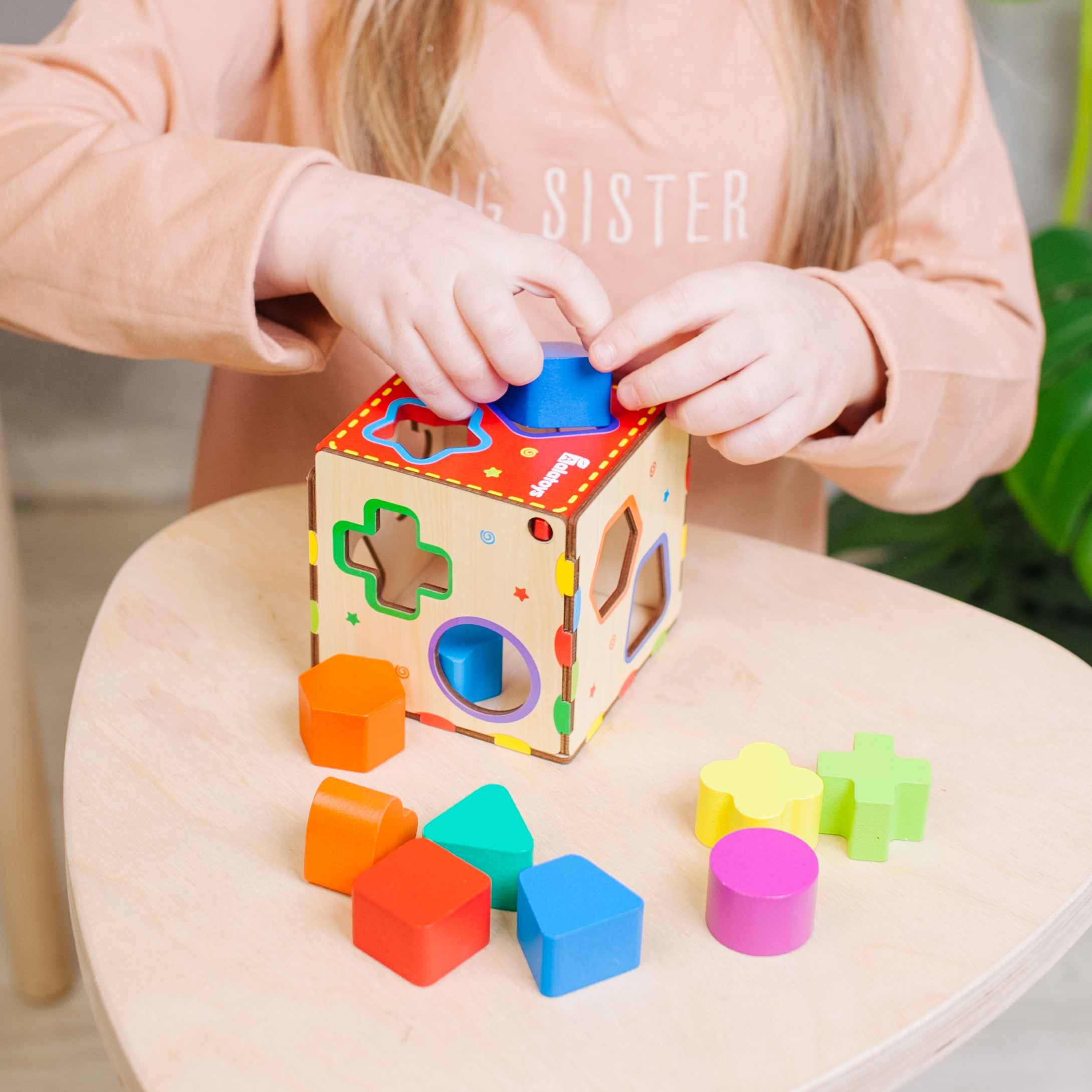 Деревянный сортер "Куб" - современная развивающая игрушка, предназначенная для малышей и помогающая им получить свои первые знания о формах и цветах.