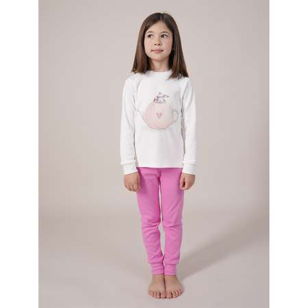 Пижама Ete Children с прямой цифровой печатью, с использованием экологически чистых красок, принт "Кролик в чайнике". Цвет-молочный, розовый. Комплектация - брюки розового цвета и лонгслив - молочного. Пояс брюк на резинке, низ брюк и рукава на манжете.