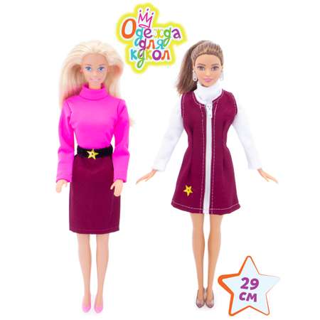Набор одежды для куклы 29 см. В набор входит сарафан, застегивается на молнию, спереди украшен пайеткой. Юбка-карандаш на широком поясе застегивается сзади на липучку. Кроме того в комплект входят два бадлона. Один бадлон выполнен из эластичной ткани бифлекс, другой из мягкого плюша. Бадлоны застегиваются сзади на липучку. Такой наряд дополнит гардероб Вашей любимицы. Ваша кукла будет выглядеть безупречно и холодную и в теплую погоду. Подойдет для куклы ростом до 29 см с объемом талии - 9-12 см, объемом груди 12-15 см, объемом бедер - 12-15 см, длиной ступни - 2,0 - 2,3 см. Набор подойдет на многие виды кукол 29-30 см. Обратите внимание! Кукла не входит в комплект!