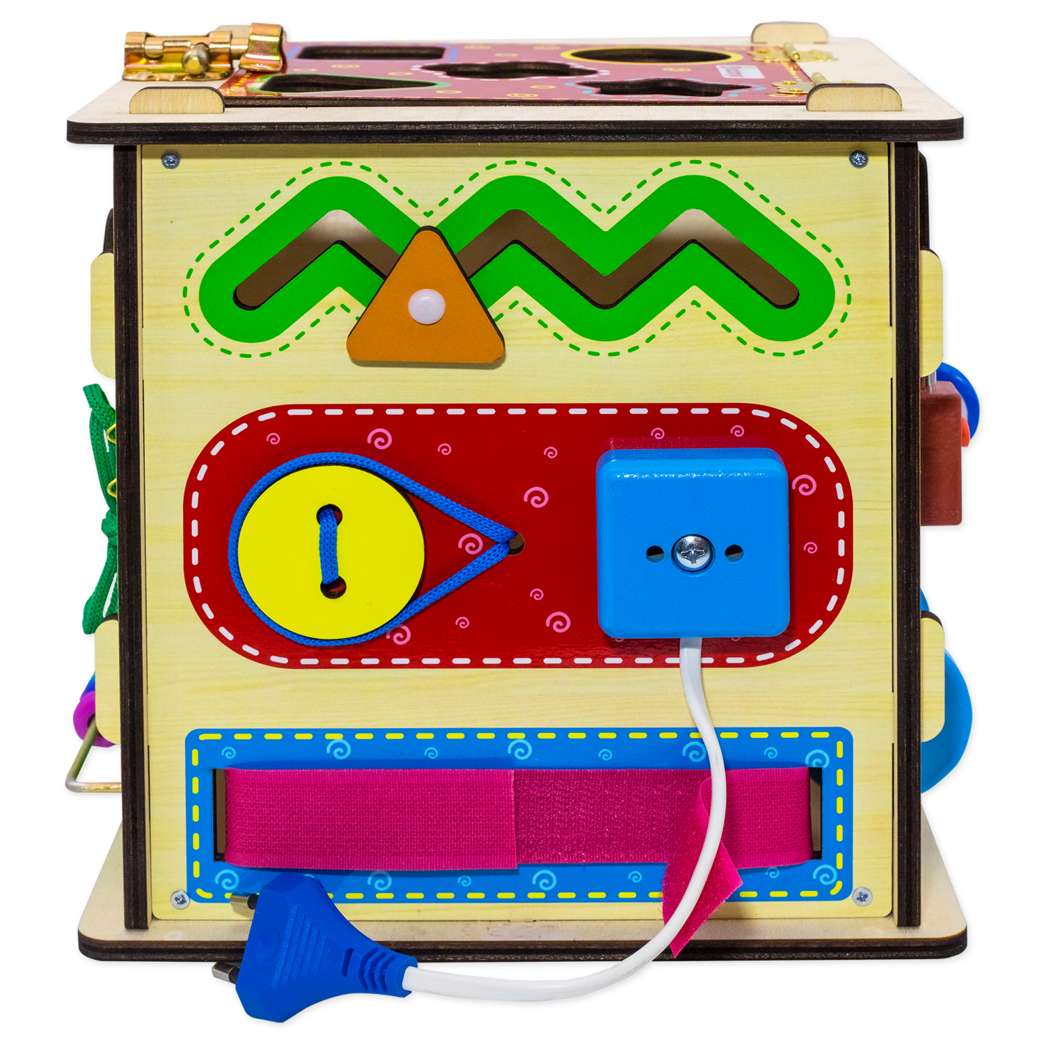 На кубе представлено множество деталей: шнуровка, липучка, пуговица, молния-застежка, шестеренки, ходилки, часики, розетка, шпингалет, роликовые колеса, передвижные бусины, барабан-погремушка, сортер с геометрическими фигурами.