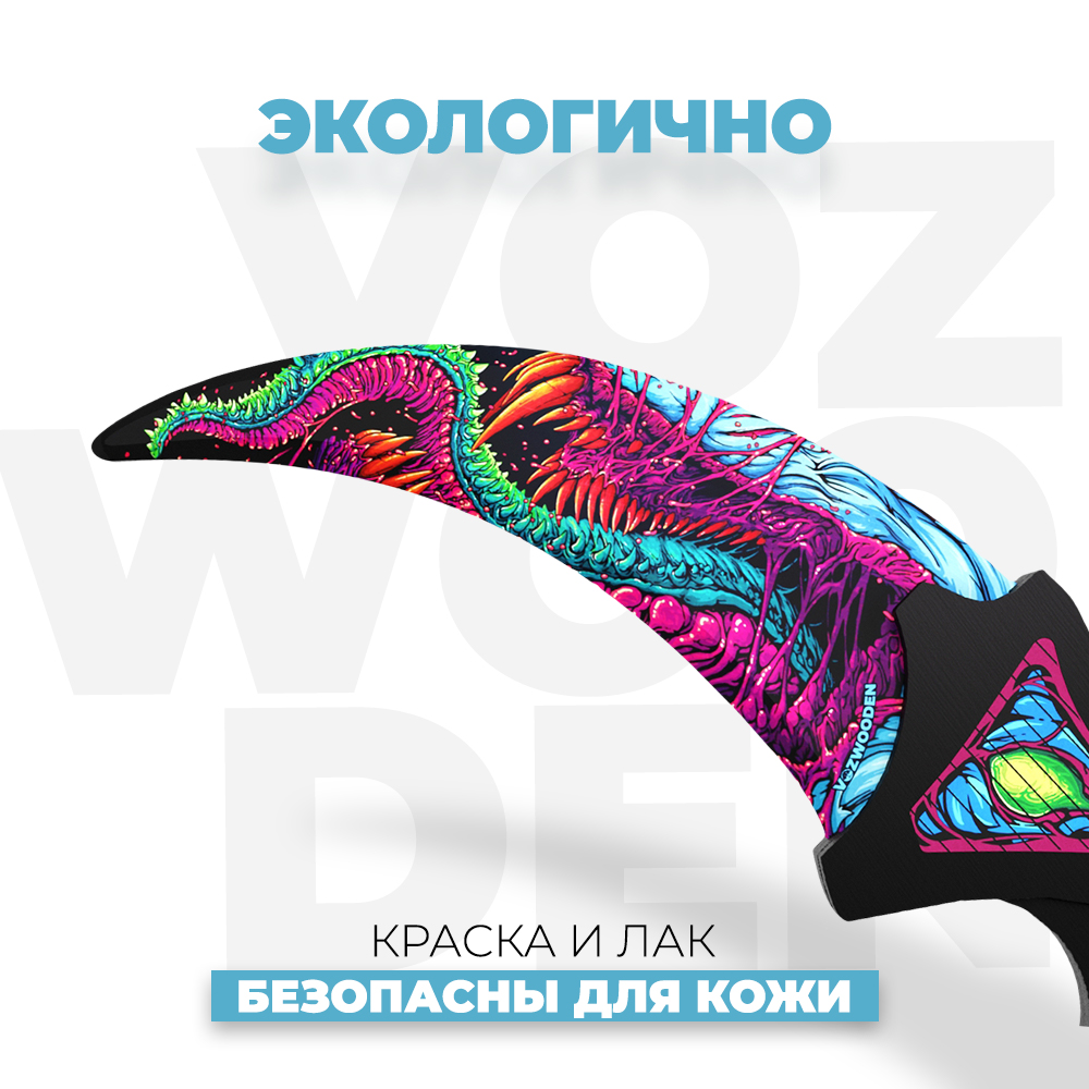 Нож керамбит из дерева выполнен из прочной березовой фанеры и достойно справляется с любыми нагрузками. Разумеется, не стоит кидать его с силой в стену или пытаться резать камни. Также дерево не любит перепадов температур и влажности. Уникальное покрытие и шлифовка во время применения не даст ножу выскользнуть, также у керамбита не заточены края и лезвия, что делает его совершенно безопасным для ребенка. Деревянное оружие CS GO окрашено с помощью стойкого и яркого пигмента. Деревянные ножи годами будут выглядеть, как новенькие, если хорошо с ними обращаться.