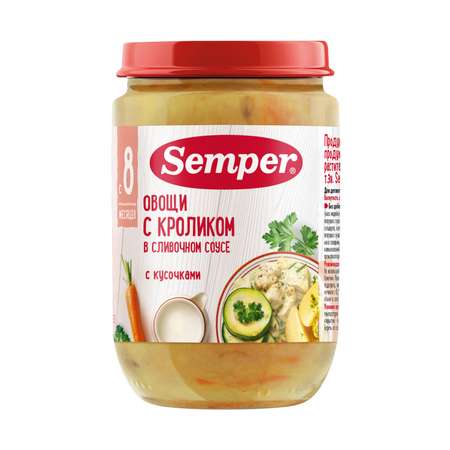 Детское пюре с кусочками Овощи с кроликом в сливочном соусе с 8 месяцев — уникальное готовое мясное блюдо на обед или ужин для детей от Semper.