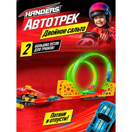 Игровой набор Handers Автотрек: «Двойное сальто»- это гоночная трасса с препятствиями трюковые кольца, пластиковые бочки. Автомобиль приводятся в движение благодаря пружинному механизму (просто потяни и отпусти) проверьте, справятся ли они со всеми препятствиями.