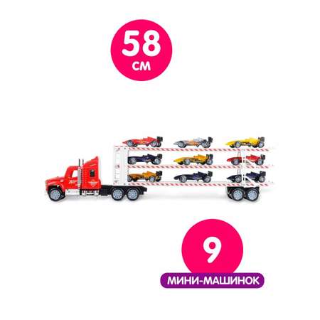 Перед вами набор машинок, это большой трейлер- красный автовоз, выполненный из прочного пластика, который везёт 9 гоночных машин к месту назначения.