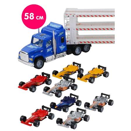 Большая модель грузовика с прицепом и красочные модели спортивной техники, это отличный подарок для мальчика на день рождения, новый год или любой другой праздник.
