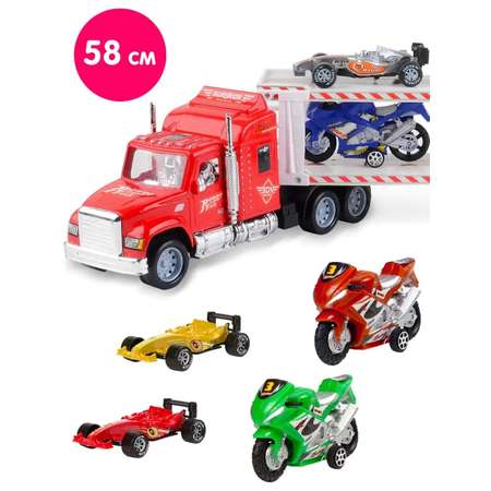 Большая модель грузовика с прицепом и красочные модели спортивной техники, это отличный подарок для мальчика на день рождения, новый год или любой другой праздник.