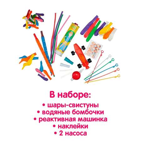В комплекте: шары-свистуны, водяные бомбочки, реактивная машинка, аксессуары, 2 насоса.