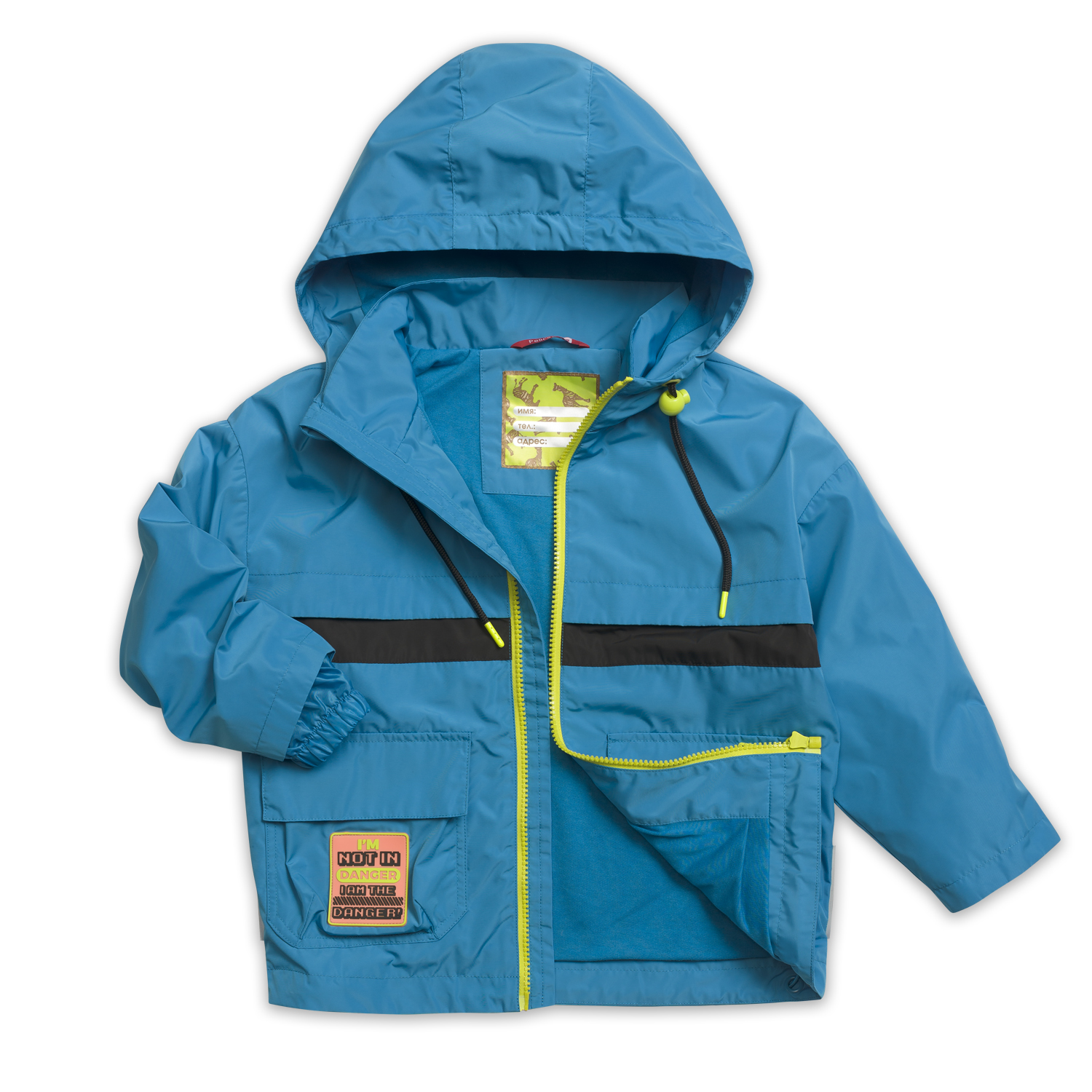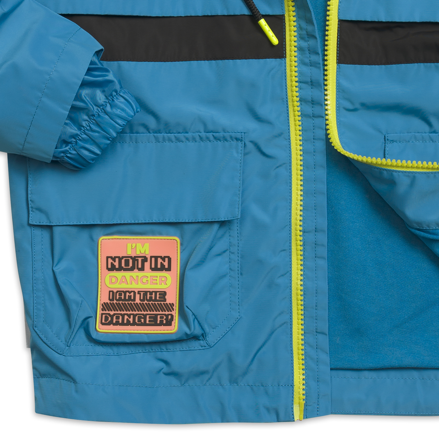 Ветровка для мальчиков свободного современного кроя, увеличенного объема и с мягкой спущенной линией плеча.Рекомендуемый температурный режим не ниже плюс 10 градусов.Цельнокроеный 2 шовный капюшон с улучшенной посадкой по форме головы. Регулировка объема капюшона шнуром, конец которого запаян в металлический наконечник, и пластиковым стоппером. Внутренний воротник из основной ткани. По переду и по спинке отрезные кокетки, имитирующие многослойность. Из-под кокетки выглядывает контрастная полоска ткани, придающая спортивность модели. Рукав объемный в верхней части, книзу заужен. Внутри рукава манжета из основной ткани с эластичной резиной внутри.Карманы накладные, объемные, с вытачками понизу, прикрываются клапанами без застежки. На кармане крупная силиконовая нашивка с шрифтовой композицией. Перевод Я не в опасности, я сам опасность. По низу изделия внутренняя регулировка объема эластиком с пластиковым стоппером. В шве кокетки и в боковых швах световозвращающая тесьма.