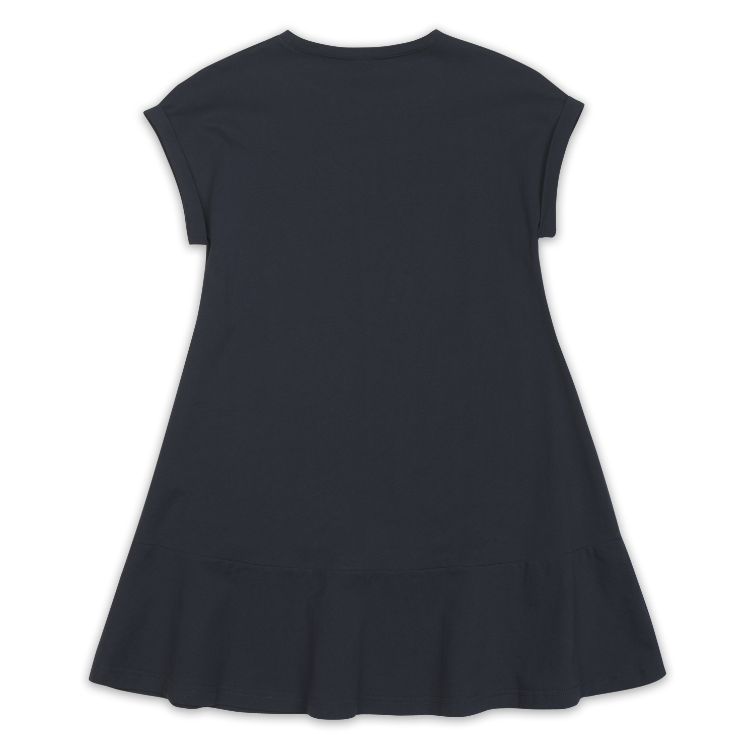 Платье трапециевидного оверсайз силуэта. Спущенная линия плеча, отворот рукава с закрепкой. По низу изделия отрезной волан. Стойкий неоновый принт. Перевод Тот, кто создает правила. Тот, кто нарушает правила..