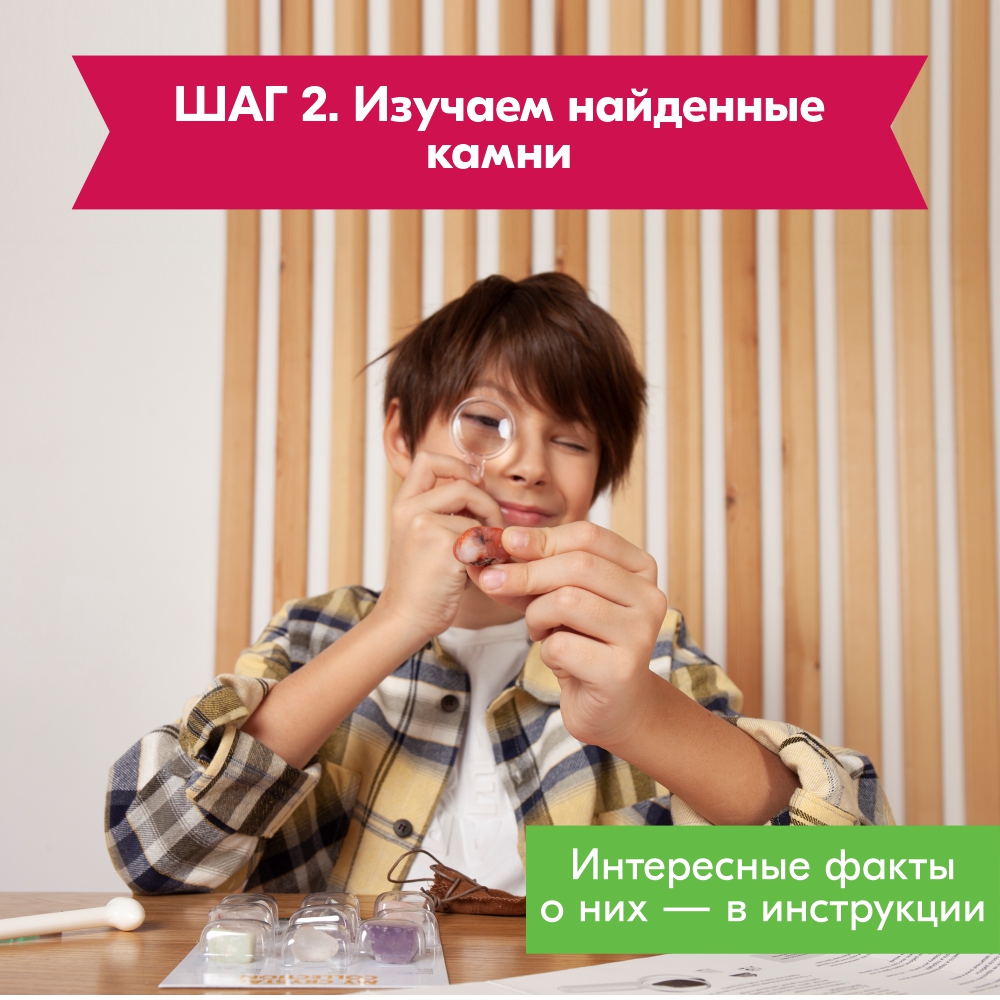 По завершении работы маленький геолог станет обладателем целой коллекции самоцветов. Ребенок будет восторженно рассматривать свои находки. Внимательно изучив камни и сравнив их с описанием в инструкции, он без труда определит, к какому виду относится каждый экземпляр его коллекции.
