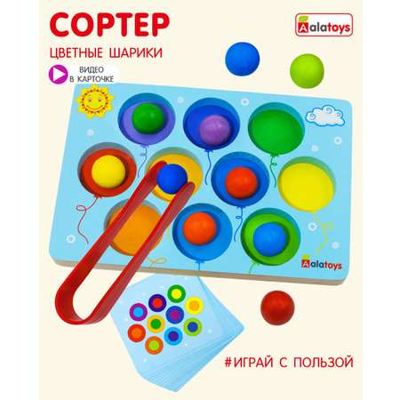 Сортер Монтессори детский деревянный с пинцетом Алатойс (10 шариков, 24 задания) ВОЗДУШНЫЕ ШАРИКИ