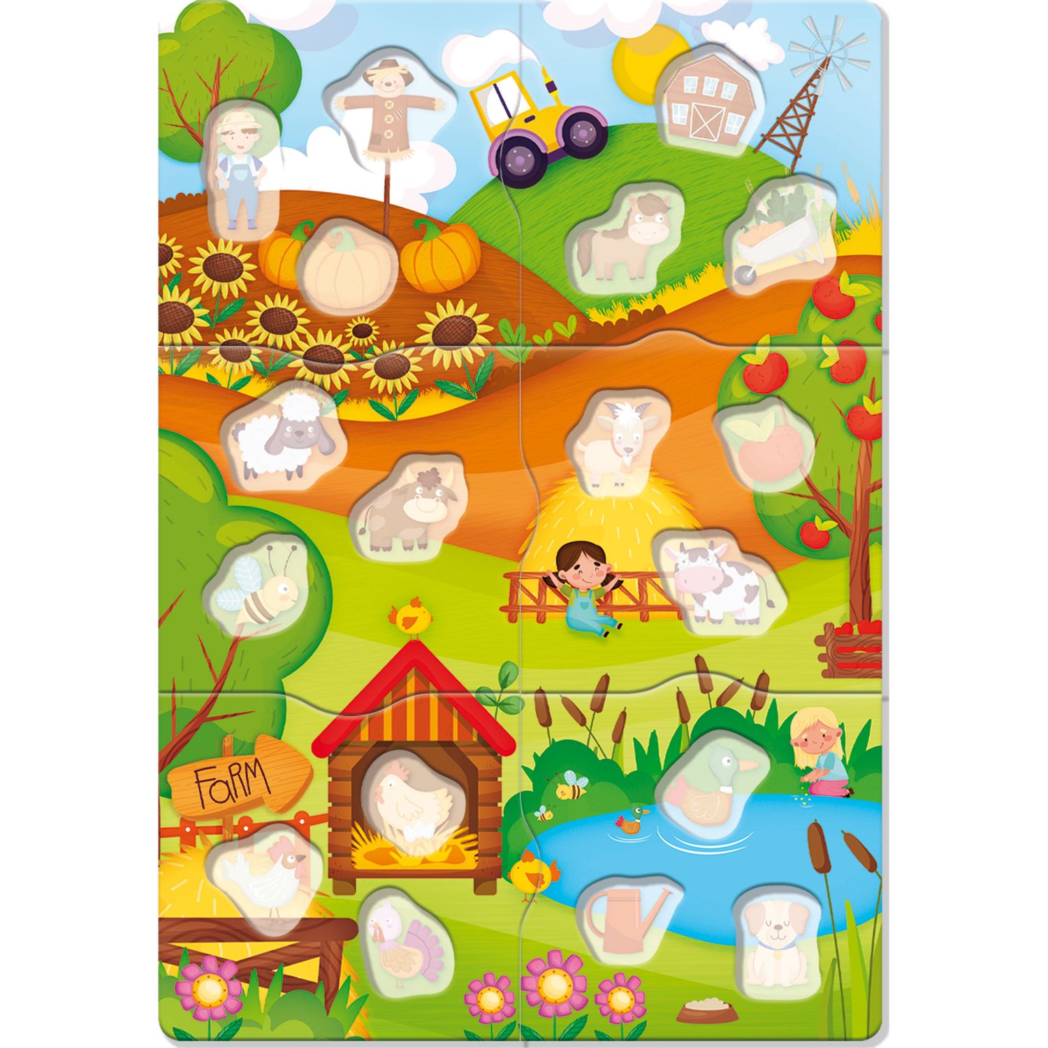 18 фигурных элементов - животных и предметов, которые нужно найти на ощупь через отверстие в коробке и вставить в окошки пазла, чтобы собрать ферму.