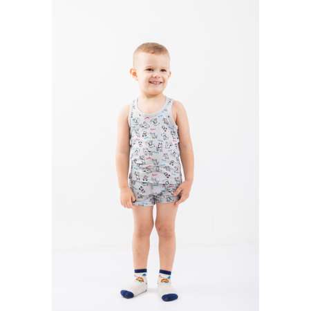 Комплект детского белья для мальчиков, состоящий из детской майки и детских трусов. Комплекты изготовлены из самого экологичного, гигроскопичного и гипоаллергенного, "дышащего" материала "кулирка". Верх-вырез горловины округлый, неглубокий, лямки средней ширины. Низ-классическая модель боксеров, пояс на резинке.
