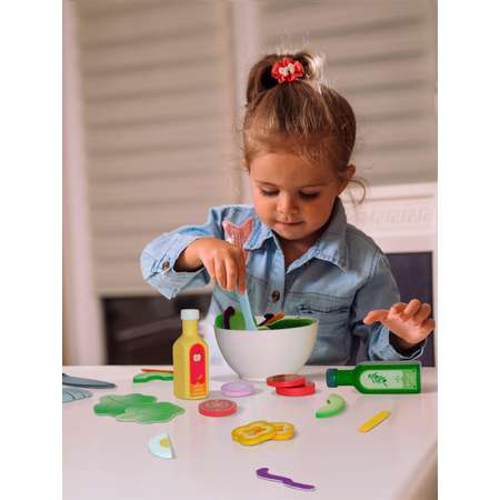 ЧТО ВКЛЮЧЕНО: идеально подходит для обучения вашего маленького повара тому, как смешивать и сочетать, этот игровой набор состоит из 39 предметов, включая деревянные кусочки яйца, авокадо, огурец, помидор, лук, перец, полоски моркови и лука, безопасный для детей игровой нож, салатницу, ложку, вилку и соус.