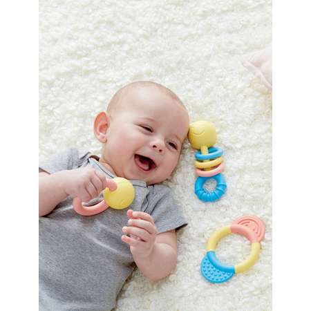 В набор входит одна погремушка-прорезыватель, одна погремушка и один прорезыватель. Подвижные кольца отлично подходят для раннего тактильного развития и отличного способа отвлечь ребенка, у которого режутся зубки, от дискомфорта.