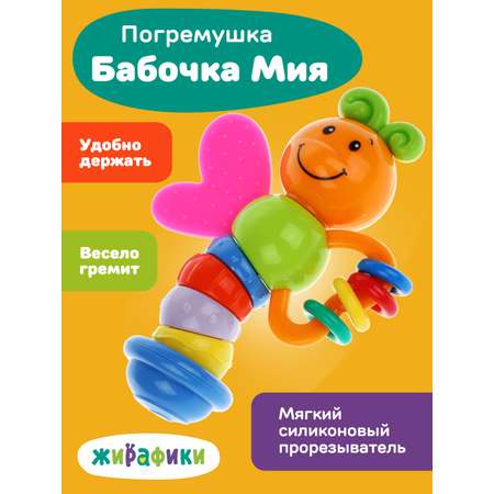 Игрушка грызунок"Бабочка Мия" надолго станет любимой игрушкой малыша. На одном крылышке бабочки — разноцветные колечки, которые можно перебирать пальчиками. Другое крылышко — это мягкий прорезыватель для зубов. Туловище бабочки сделано из элементов разного цвета с разным фактурным рисунком для развития тактильных ощущений у малыша. Тактильная игрушка для новорожденного мальчика девочки - подарок на рождение ребенка. Моя первая игрушка для развития мелкой моторики, грызунок прорезыватель для зубов, развивающая игрушка в дорогу. Размер игрушки: 13 см. Изделие изготовлено из пластмассы.