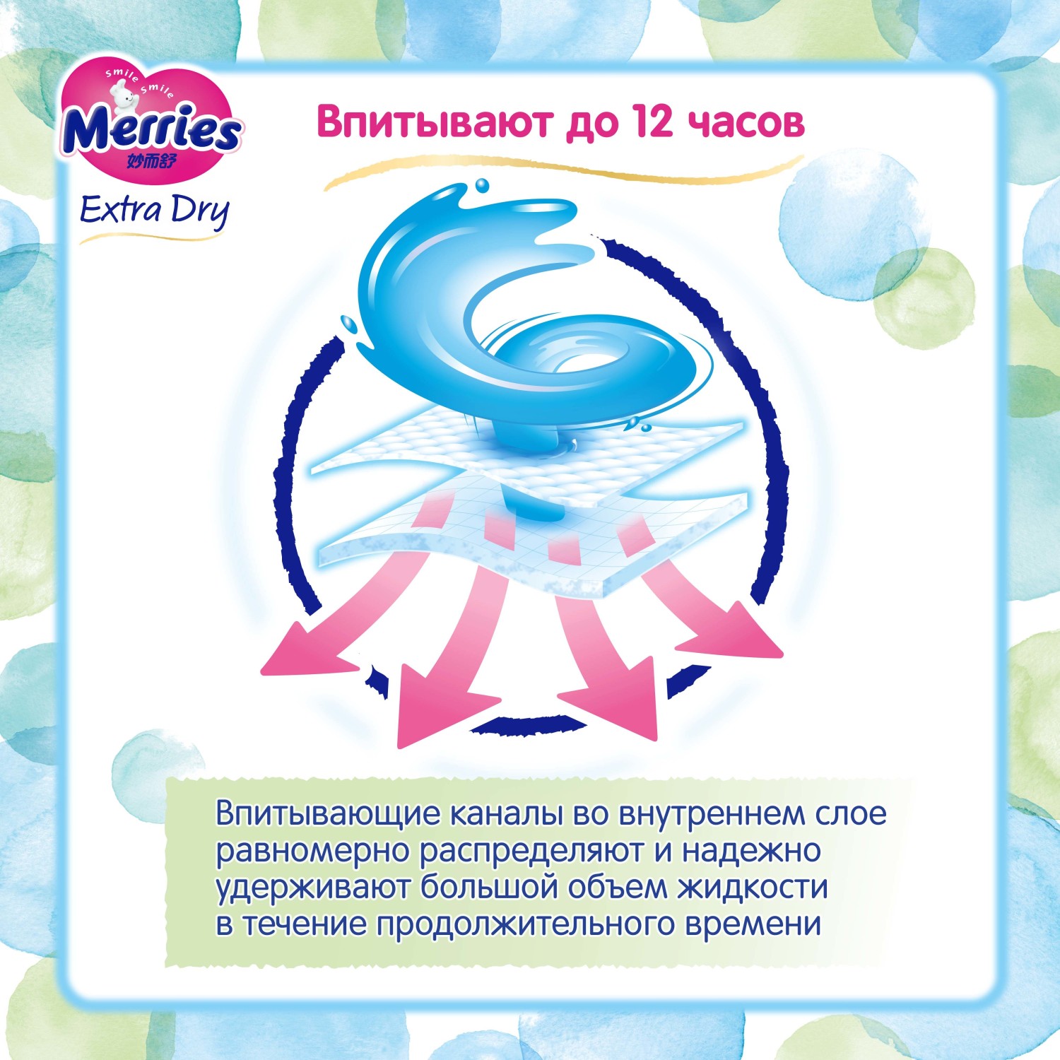 Сухость и комфорт в течение всего дня в подгузниках Merries Extra Dry! Подгузники Merries Extra Dry сочетают в себе японские технологии и современные материалы: