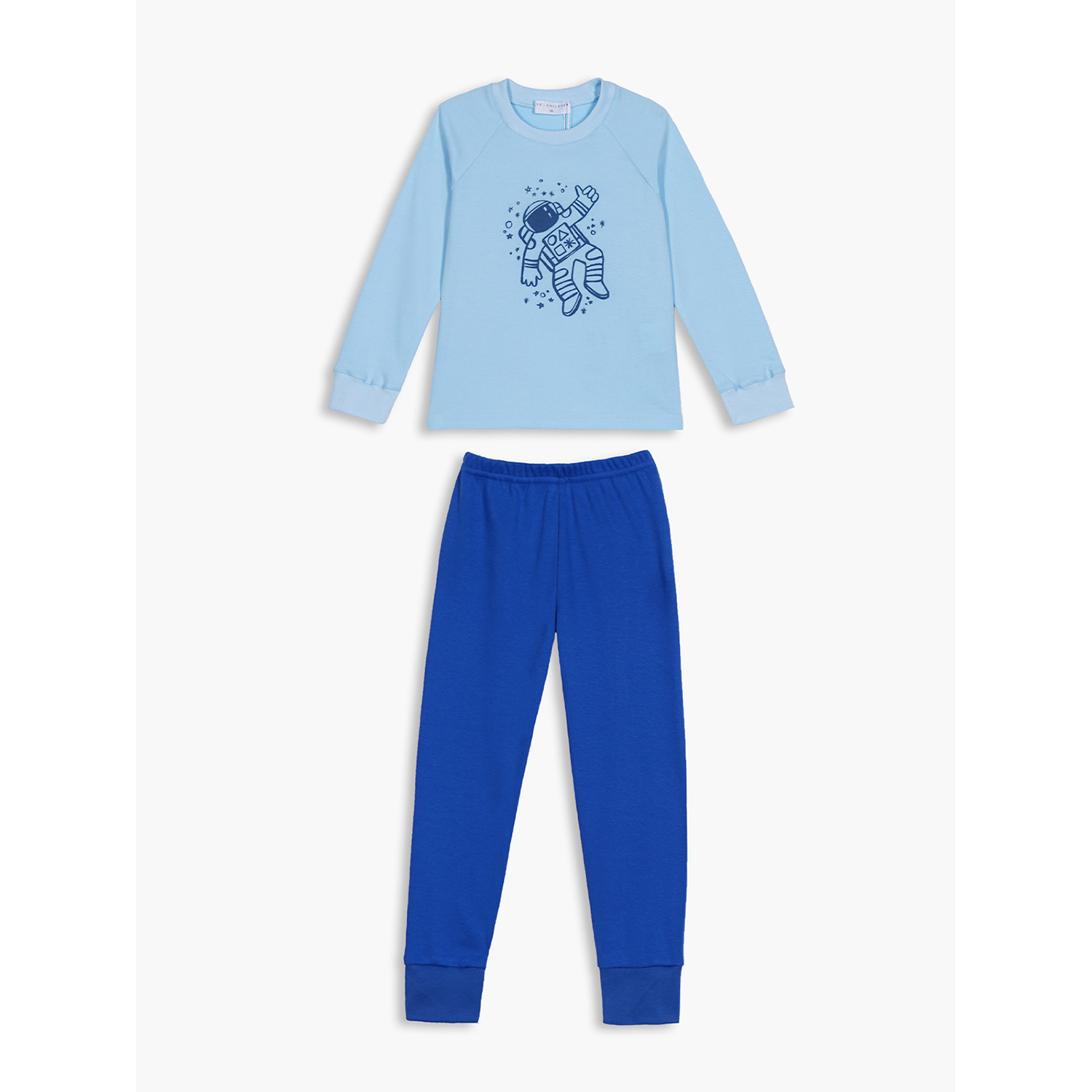 Пижама для мальчика и девочки. Ete Children с прямой цифровой печатью, с использованием экологически чистых красок, принт "космонавт". Цвет-голубой, синий. Комплектация - брюки ярко-синего цвета и лонгслив - нежно-голубого. Пояс брюк на резинке, низ брюк и рукава на манжете.