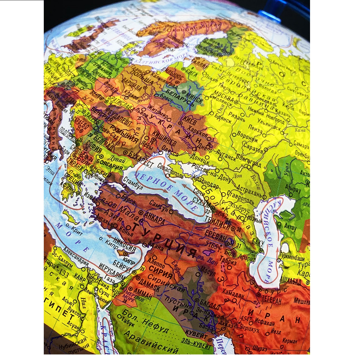 Крупный диаметр 32 см позволяет хорошенько рассмотреть все надписи на глобусе.А деревянная подставка и лаконичная металлическая дуга отлично впишутся в интерьер комнаты школьника. Глобус можно использовать в качестве оригинального светильника.