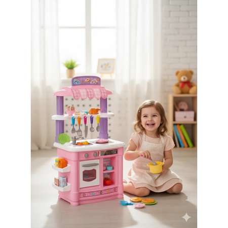 Этот замечательный подарочный набор - настоящее открытие для малышей в возрасте от 3 лет. Игровая детская кухня это один из способов развить творческие навыки и воображение вашего ребенка. Развивающая игрушка станет прекрасным подарком как девочке, так и мальчику. Дети обожают такие игры, посвященные кухне, и этот подарок станет отличным выбором как в день рождения, так и на праздник для мамы и ребенка. Перед вами игровой набор, который легко собирается до полноценной кухни размером 47х85х30 см. Также в наборе есть функциональная раковина с краном, из которого льётся вода, конфорка, духовка. Ручки духовки поворачиваются и включают звуки приготовления пищи. Все шкафчики и ящики открываются и закрываются. Набор включает большую рабочую стойку. Из крана течёт вода. Это игровой набор - кухня, представляет собой мини кухню в виде полноценной функциональной кухонной зоны со всеми необходимыми элементами для готовки и мойки посуды. В наборе детской посуды есть всё необходимое: кастрюля, крышки, сковорода, тарелки, ложки, нож для приготовления еды, а также набор продуктов. Игровые предметы выполнены из высококачественного пластика – это обеспечивает безопасность при детской игре. Подарочный комплект уличной кухни имитирует настоящий процесс готовки. Это уголок для посуды и кухонной электрической плиты и мойки для посуды. Это позволит ребенку почувствовать себя не только шеф поваром, но и разовьет его мелкую моторику, творческое, логическое мышление. Эта детская кукольная кухня сделает процесс готовки ещё увлекательнее!