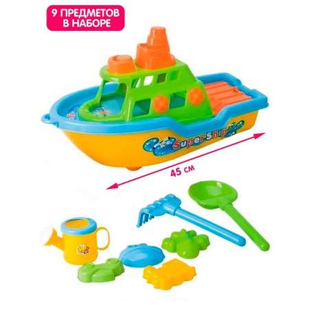 В комплекте: корабль 1 шт.; лопатка 1 шт.; грабли 1 шт.; формочки 4 шт.; лейка 1 шт.