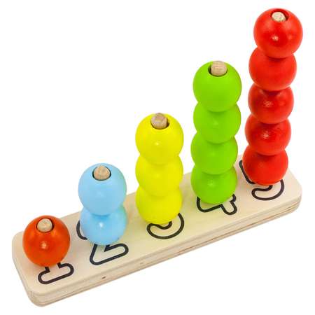 Пирамидка детская «Счёты» — развивающая игрушка от Алатойс, представляющая собой деревянную основу с 5 шкантами и 15 колец для нанизывания. Основная задача: нанизывать нужное количество колец, согласно цифрам на основании. Благодаря этой игрушке ребёнок обучается основам счета.
