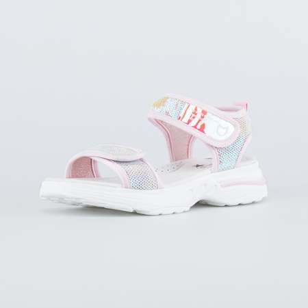 Сандалии декорированы перламутровыми пайетками. Внимание привлекает массивная двухцветная подошва.