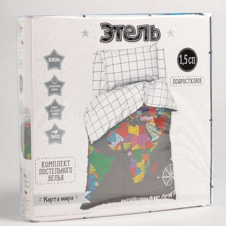 Этот комплект — идеальный выбор для тех, кто мечтает стать путешественником, географом или просто любит яркие и необычные вещи! На сером фоне — красочная карта мира, где каждая страна обозначена своим названием на русском языке. А белое постельное бельё с чёрной клеткой добавляет образу стиля и современности.