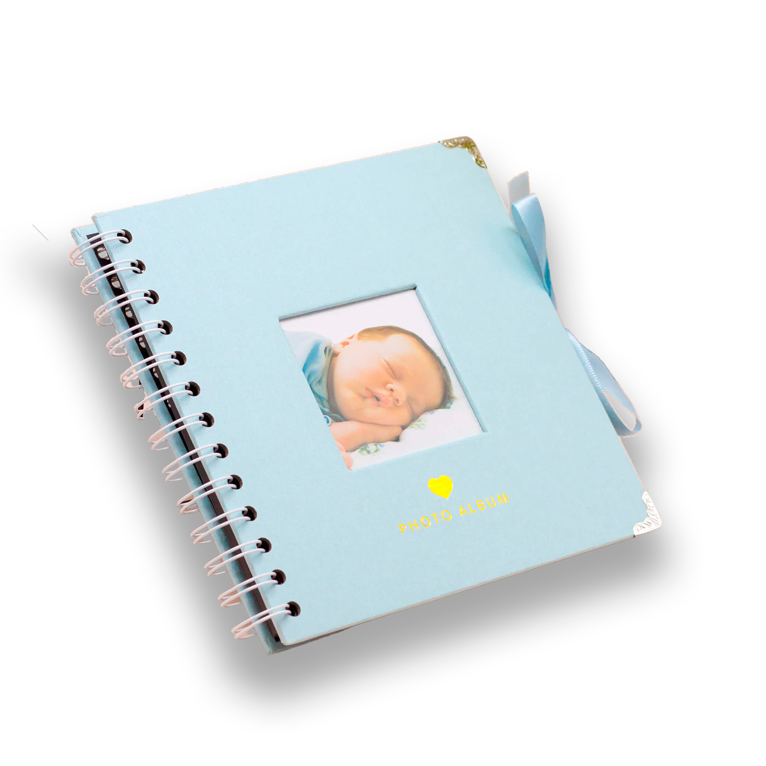 Обложка выполнена из плотного картона с мягким матовым покрытием. Уголки дополнительно защищены металлическими накладками, поэтому альбом не мнётся по краям и долго остаётся аккуратным, даже если его часто перелистывают. По боковой стороне — атласная лента в тон, её можно завязать бантом. На лицевой стороне есть окошко под фотографию: достаточно вставить любимый кадр малыша, и альбом превращается в очень личную семейную вещь, а не просто в блокнот для фото.