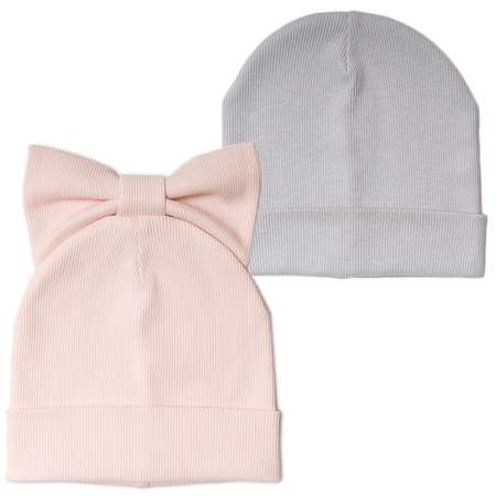 Комплект для девочки состоит из 2-х шапок. Одна шапка базовая в сером цвете с отворотом, другая – в нежном розовом цвете с отворотом и нарядным бантом.