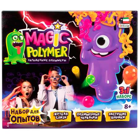 Набор Magic Polymer- это 3 увлекательных и веселых опытов со свойствами полимеров. Проведите опыт с яркими полимерными червячками, создайте глазастую слизь, которая порадует любого ребенка, и вырастите волшебные шарики.